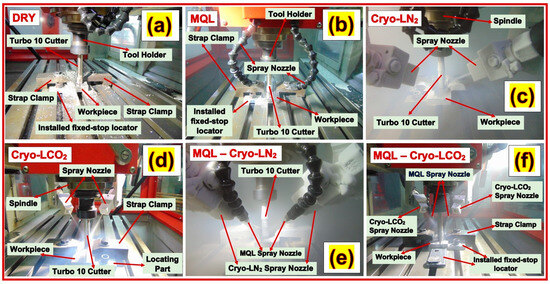 Hybrid cooling strategies combined MQL and cryogenic fluids. LN2 and LCO2 were supplied through vacuum-insulated hoses to 3 mm nozzles under 2.5 bar pressure. MQL nozzles, delivering pure coconut oil at 3 bar and 200 milliliters per hour, were placed 85 mm from the cutting zone, while cryogenic nozzles were positioned 115 mm away. Both systems operated concurrently, as illustrated in Figure 3e,f.