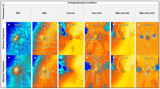 Thermal conditions in machining significantly impact tool life, chip morphology, and dimensional precision. Excessive heat promotes built-up edge formation, chip shrinkage, and post-machining surface hardening, particularly when machining difficult-to-cut materials like Hastelloy C276. Dry cutting amplifies these effects due to increased friction, accelerating tool degradation and reducing surface quality. Cooling and lubrication methods aim to mitigate thermal accumulation and improve process stability [51]. These thermal effects also influence cutter geometry, surface integrity, and machining productivity. Figure 4 illustrates temperature variations in the cutting zone during the fifth experiment for six machining environments, providing a visual benchmark of thermal mitigation strategies through thermal maps captured via infrared imaging. Real-time temperature distribution was monitored using a thermal camera to ensure accurate assessment of heat generation.