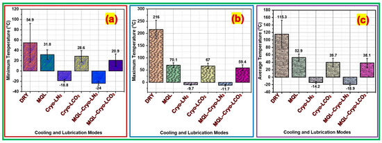 Column plots showing cutting zone temperatures under six machining environments: (a) minimum temperature, (b) maximum temperature, and (c) average temperature. Each column includes standard deviation error bars to indicate variability across trials under dry machining, minimum quantity lubrication (MQL), and cryogenic cooling with liquid nitrogen (Cryo-LN2) and liquid carbon dioxide (Cryo-LCO2), as well as hybrid combinations of MQL with Cryo-LN2 and Cryo-LCO2.