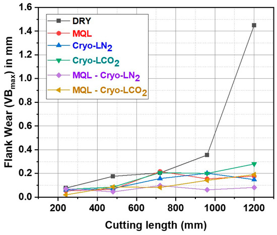 Relative to dry machining, the reduction in flank wear was 87.79% (MQL), 89.79% (Cryo-LN2), 80.68% (Cryo-LCO2), 94.34% (MQL–Cryo-LN2), and 86.89% (MQL–Cryo-LCO2). MQL–Cryo-LN2 exhibited the strongest wear mitigation, followed by Cryo-LN2 and MQL. The coconut oil used in MQL contributed to these results through its high oxidation stability (35.4 h at 100 °C) and flash point (325 °C) [53], allowing it to form a durable lubricating film that reduces friction and surface damage.