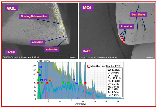 SEM and EDS analysis of cutter surfaces after machining with minimum quantity lubrication (MQL) using pure coconut oil, conducted at a cutting speed of 45 m per minute and a cutting feed of 98.45 mm per minute.