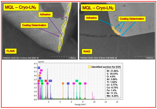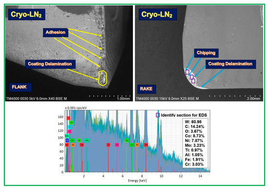 SEM and EDS characterization of cutter surfaces following Cryo-LN2 cooling, carried out at a cutting speed of 45 m per minute and a cutting feed of 98.45 mm per minute.