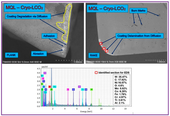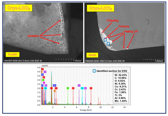 SEM and EDS analysis of cutter surfaces after Cryo-LCO2 cooling, performed at a cutting speed of 45 m per minute and a cutting feed of 98.45 mm per minute.