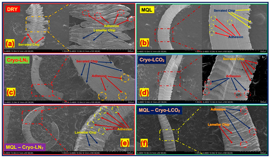 - Chip formation: SEM imaging revealed extensive serrations and damage under dry machining, whereas hybrid MQL–Cryo-LN2 and MQL–Cryo-LCO2 generated more uniform lamellar chips and reduced frictional defects.