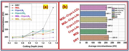 Figure 15 shows microhardness trends and average values for Hastelloy C276 under six cooling and lubrication conditions, based on measurements taken after five cutting lengths in each environment.