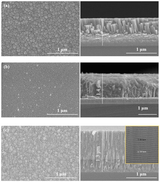 SEM images exhibiting the surface morphologies (left) and cross-section (right) of (a) TiN, (b) MoN, and (c) MoN/TiN coatings.