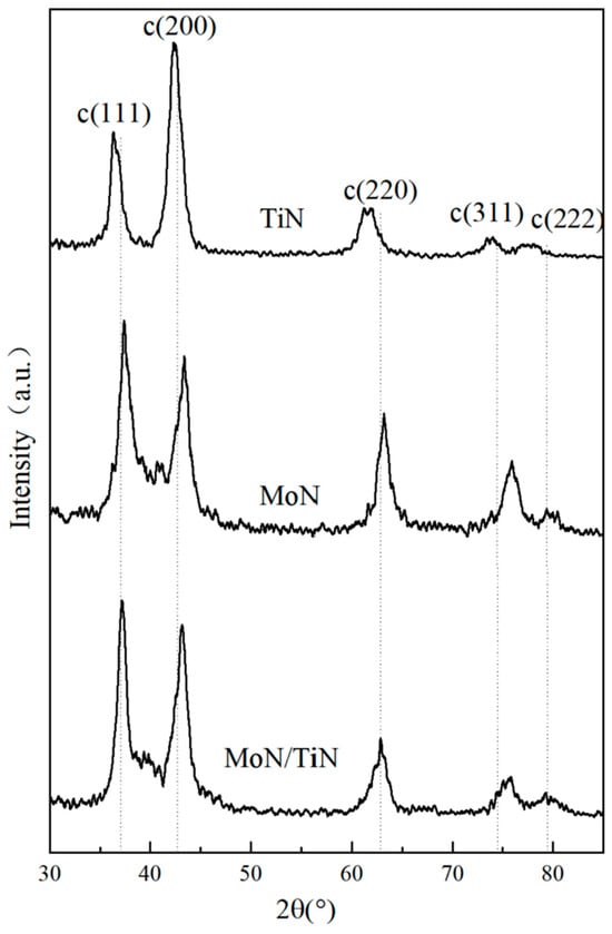 The XRD patterns of the TiN monolithic, MoN monolithic, and MoN/TiN multilayer coatings are shown in Figure 2. The XRD pattern of the TiN coating confirmed the presence of a face-centered cubic TiN phase. Distinct diffraction peaks observed at 36.6°, 42.6°, 61.7°, 74.0°, and 77.9° could be indexed to the (111), (200), (220), (311), and (222) crystallographic planes of TiN, respectively. This pattern demonstrated that the TiN coating comprised grains with multiple crystallographic orientations, among which the (111), (200), and (220) planes were dominant []. The well-defined sharp peaks further indicated the high crystallinity of the deposited TiN coating []. The XRD patterns of the MoN and MoN/TiN coatings exhibited a face-centered cubic (FCC) NaCl-type structure, as evidenced by the appearance of (111), (200), (220), (311), and (222) diffraction peaks. In general, the MoNx thin films exhibited diffraction peaks characteristic of an (FCC) NaCl-type structure, with nearly identical peak positions, corresponding to the (111), (200), (220), (311), and (222) planes of the cubic structure [].