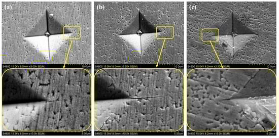 The Vickers indentation (HMV-2, SHIMADZU, Kyoto, Japan) was used to evaluate the fracture toughness (KIc) of the coatings by the equation as follows []: