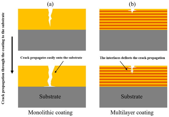 Schematic of the cracking behavior of (a) monolithic and (b) multilayer coatings.
