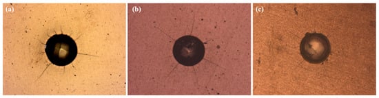 Adhesion between the coating and substrate was assessed using a Rockwell tester utilizing a force of 60 kgf and a loading time of 25 s. The indenter effect was observed using an optical microscope, and the adhesion quality was interpreted following the VDI 3198 standard [].