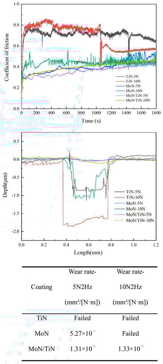 The wear rates of the MoN and MoN/TiN multilayer coating samples were 5.27 × 10−7 and 1.31 × 10−7 mm3/(N·m), respectively, under a 5 N load (with the TiN coating having failed). At a 10 N load, the wear rates of the MoN/TiN multilayer coating samples were 1.33 × 10−7 mm3/(N·m), while the MoN coating had failed. Among the analyzed coatings, both TiN and MoN coating samples failed under 5 N and 10 N loads, respectively. The MoN/TiN multilayer coating samples maintained excellent wear resistance under both loads, demonstrating superior wear performance compared with the TiN and MoN coating samples under the tested conditions.