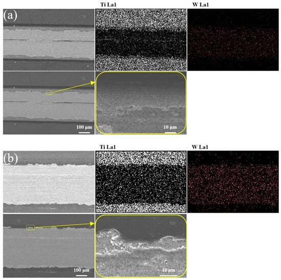 Under a load of 5 N, the TiN coating samples exhibited severe wear and a prominent W elemental signature (Figure 7a), indicating coating removal and substrate exposure. The wear track displayed a furrow-like morphology, and fatigue wear was initiated at the center and propagated to the edges. Under a load of 10 N, the wear track considerably widened, and the W elemental signature intensified (Figure 7b), further confirming the substrate exposure. A notable increase in film flaking was observed inside the wear marks, where the coating was detached and extensively delaminated. Deep grooves and severe fatigue wear were observed throughout the track, demonstrating that high loads considerably accelerate the failure of the TiN coating.