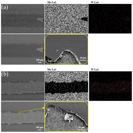 Under a load of 5 N, the MoN coating samples exhibited minor abrasive wear, and the W element content was substantial (Figure 8a), indicating that the coating remained mostly intact. However, slight spalling was observed, suggesting the onset of localized wear. Conversely, under a load of 10 N, the wear track of the MoN coating samples was considerably wider than that under 5 N, and severe fatigue wear was evident. The elemental distribution map (Figure 8b) revealed the presence of the W element, confirming the exposure of the substrate material because of coating failure.
