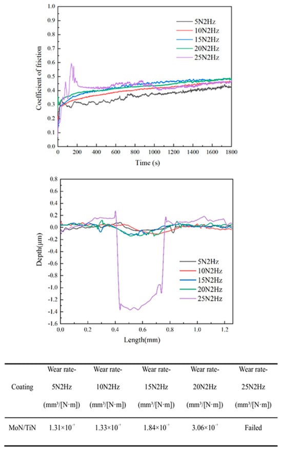 Figure 9 presents the coefficient of friction, wear profile, and wear rate of the MoN/TiN multilayer coating samples determined through the friction and wear tests at a constant frequency and duration (2 Hz and 1800 s). The elemental distribution maps and wear trace morphology of the multilayer coating under different loads are displayed in Figure 10 and Figure 11, respectively.