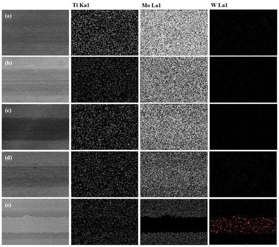 Ti, Mo, and W element distribution map of the MoN/TiN multilayer coating samples under different loads: (a) 5, (b) 10, (c) 15, (d) 20, and (e) 25 N.