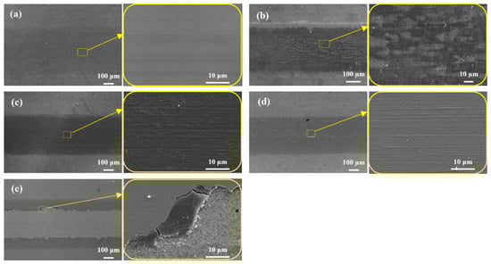 Table 1 shows that the MoN/TiN multilayer coating demonstrated the highest hardness (32.34 GPa), surpassing the MoN (23.98 GPa) and TiN (19.73 GPa) coatings. The improved hardness of the MoN/TiN multilayer coating was consistent with the characteristics reported for TiN/TiC multilayers [], in which the interfaces suppress the dislocation motion via the Hall–Petch mechanism. The SEM images revealing the multilayer structure (Figure 1), and XRD analysis (Figure 2) further validate the interfacial strengthening. The high hardness of the multilayer coating may improve its wear resistance, which is critical for the friction performance. Additionally, among the analyzed coatings, the MoN/TiN multilayer coating exhibited the highest H/E and H3/E2 values, suggesting its better wear resistance and toughness than the single-component coatings.