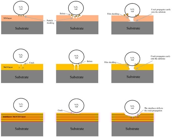 The multilayer structure of the MoN/TiN coating is crucial in wear resistance. The alternating TiN and MoN layers disrupt columnar grain growth and provide multiple interfaces that hinder crack propagation, enhancing the toughness and wear performance of the multilayer coating [,]. Figure 12 illustrates the friction mechanism of the TiN, MoN, and MoN/TiN multilayer coatings. The TiN coating initially underwent small particle shedding, creating wear tracks resembling furrows (Figure 7), in which abrasive wear is the dominant mechanism. With the continuous progression of the test, widespread coating shedding occurs, ultimately causing coating failure. The MoN coating developed cracks during wear owing to inadequate adhesion strength. These cracks extended to the substrate (Figure 8), thereby leading to adhesive wear and extensive coating shedding, which substantially increased the wear rate. For the MoN/TiN multilayer coating, although cracks were formed during wear, the layered structure successfully hindered crack propagation, thereby preventing crack growth toward the substrate and the subsequent extensive coating shedding. This explains the higher performance of the MoN/TiN multilayer coating than that of the TiN and MoN coatings, which lack the aforementioned structural advantages.