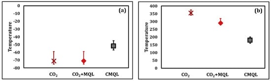 The cutting temperature is the most prominent factor in machining. Most of the researchers performed different experiments on different materials. Figure 1 investigated the cutting temperature at a feed rate of 0.2 mm/rev and a cutting speed of 150 m/min for the Ti6Al4V by using the CO2, CO2 mixed with MQL, and CMQL. Figure 2a shows the temperature of the material before it started, and Figure 2b showes the temperature while machining was performed. The temperature drop using the CMQL method is around 49% compared to the CO2 cryogenic cooling. The cutting temperature reduced from more than 350 to around 150 °C. The mixture of CO2 with MQL is also investigated in this experiment, showing enhanced results of up to 19%. Cryo-MQL turning of Inconel 686 significantly enhanced machining performance, reducing cutting temperature by 33%, surface roughness by 25%, and tool wear by 40%, compared to conventional methods []. Cryogenic treatment of cemented carbide enhanced wear resistance by 28% and cutting performance by 35%, due to refined microstructure and improved hardness stability [].