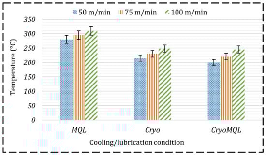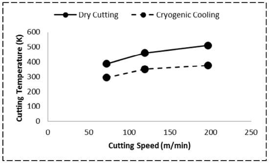 Figure 4 represents the temperature of the experiment at different cutting speeds. As from the metal cutting theory, the cutting temperature increases as the cutting speed increases. In Figure 4, the cutting properties of duplex stainless steel are investigated at a feed rate of 0.11 mm/rev, and the cutting depth is 1 mm using cryogenic cooling; the dry cutting condition is contrasted with the cryogenic cooling condition. The cutting temperature is decreased extensively, which is more than 50% compared to the dry machining. The liquid nitrogen is utilized in cryogenic cooling to reduce the temperature of the cutting tool. Figure 5 shows the performance of a nickel alloy under different cooling conditions. The temperature is increased, according to the metal cutting theory, by increasing the feed rate or cutting speed. In the experimentation, the feed rate and depth of cut are constant at 0.12 mm/rev and 0.5 mm, respectively, while the cutting speed varies from 50 to 100 m/min. The highest temperature was observed using the MQL system, and it was reduced by around 22% using liquid nitrogen. The hybrid technique reduced further by up to 25% compared with the MQL system. The mixture of cryo and MQL showed the best result over all other techniques available.