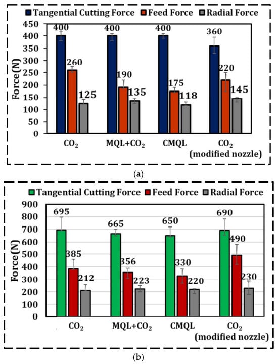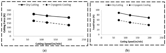 Variation in forces at different cutting speeds and cooling conditions: (a) cutting force and (b) feed force [].
