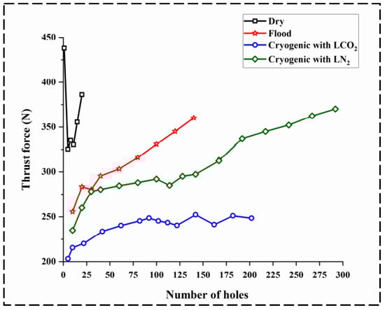 Force analysis is a critical aspect of machining studies, as cutting forces directly impact power consumption and, consequently, the overall sustainability of the process. In this study, drilling operations were conducted under various cooling conditions to evaluate their influence on machining sustainability. The cooling strategies included dry machining, conventional flooded (wet) machining, and two cryogenic coolants: liquid carbon dioxide (LCO2) and liquid nitrogen (LN2) shown in Figure 7. Among all the methods tested, cryogenic machining using LN2 demonstrated the most favorable performance in terms of force reduction. Specifically, the use of LN2 as a cooling medium led to a reduction in thrust force by approximately 75% compared to dry machining, 29% compared to flooded machining, and 18% compared to LCO2. This significant decrease in cutting forces is attributed to the superior cooling capacity of LN2, which minimizes tool–workpiece interface temperature and reduces friction. These findings highlight the potential of LN2-based cryogenic cooling as a sustainable and energy-efficient alternative for high-performance drilling operations.