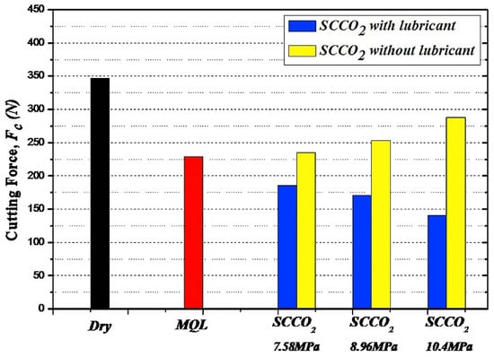 The cutting forces observed during the machining of high-grade steel under various cooling and lubrication conditions are presented in Figure 8. The study evaluates the effects of dry machining, minimum quantity lubrication (MQL), and supercritical carbon dioxide (SCCO2) at varying pressure levels, with and without the addition of lubricant. The results clearly indicate that SCCO2 with lubricant at a pressure of 10.4 MPa produced the lowest cutting forces across all tested conditions. Specifically, a reduction of approximately 40% in cutting force was recorded when compared to MQL, demonstrating the superior performance of this cooling strategy. This significant force reduction can be attributed to the enhanced penetration and lubrication efficiency of the supercritical fluid, which improves chip evacuation, reduces friction at the tool–chip interface, and lowers mechanical resistance during cutting. These findings confirm that SCCO2 with lubricant at optimized pressure levels offers a highly effective solution for minimizing cutting forces and improving machining efficiency in high-grade steel applications.