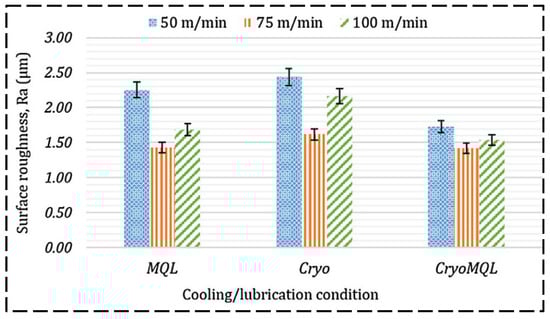The surface roughness is also one of the parameters for measuring the performance of the cutting operation. In Figure 10 below, the study presented the surface roughness at different cutting speeds and different coolant methods. Here, the surface roughness Ra is measured from the primary line. The data below shows that the hybrid technique reduces the surface roughness more than all the other cooling conditions. In this experimentation, the researcher used the constant feed rate and depth of cut, but the cutting speed varied from 50 to 100 m/min. The cryogenic showed the highest roughness value compared to it by using MQL and CryoMQL; the surface roughness decreased by 14% and 25%. The study investigates how cryogenic cooling during machining affects surface integrity and corrosion resistance of Monel-400 alloy, highlighting its potential as a sustainable manufacturing approach []. The paper experimentally examines how cryogenic machining influences the surface integrity of maraging steel, demonstrating improvements in surface finish, hardness, and reduced thermal damage []. Cryogenic machining of wrought Ti6Al4V improved fatigue strength by 21%, reduced tensile residual stress by 36%, and enhanced surface integrity through a 31% decrease in surface roughness compared to conventional dry machining []. Cryogenic machining of aluminum MMCs with biomimetic textured tools reduced cutting forces by up to 25%, decreased tool wear by 30%, and improved surface finish by 22%, enhancing overall sustainability []. In cryogenic abrasive air-jet machining of PDMS, increasing the cooling rate led to a 40% reduction in abrasive embedding and improved surface integrity by enhancing material brittleness and minimizing elastic recovery [].