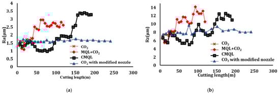 The surface roughness of TiAl4V under different cooling condition a cutting speed of 150 m/min and feed rate of 0.2 mm/rev: (a) average roughness Ra and (b) mean roughness Rz [].