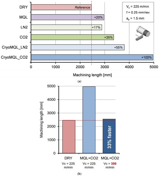 Comparative analysis of different cooling techniques: (a) Effect of varying cutting speeds on machining performance; (b) Influence of machining length on tool wear and temperature across cooling methods [].
