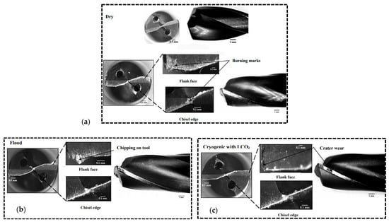 Images of drill bits after drilling operations using different cooling systems: (a) Dry machining, (b) Minimum Quantity Lubrication (MQL), (c) Cryogenic cooling [].