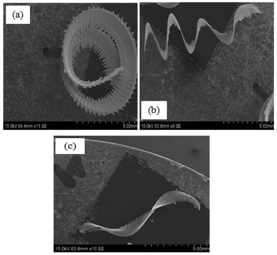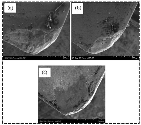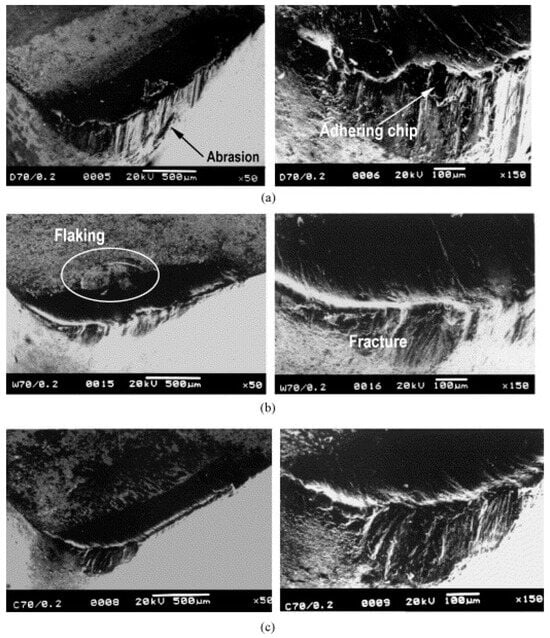 SEM images of the tool at a cutting speed of 70 m/min and feed rate of 0.20 mm/rev under three environments: (a) dry machining, (b) wet machining, and (c) cryogenic machining [].