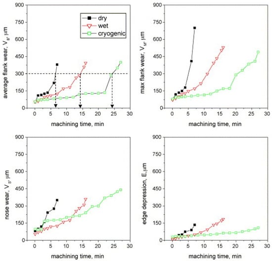 - Venugopal, K.A.; Paul, S.; Chattopadhyay, A.B. Growth of tool wear in turning of Ti-6Al-4V alloy under cryogenic cooling. Wear 2007, 262, 1071–1078. [Google Scholar] [CrossRef]