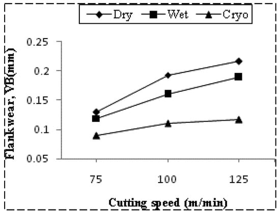 Flank wear at different cutting speeds at a feed rate of 0.02 mm/tooth [].