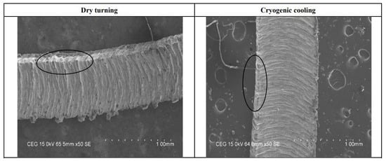 Researchers examined the cutting force and feed force properties of duplex stainless steel 2205 under dry and cryogenic conditions. As shown in Figure 9, the cutting force decreased under the cryogenic condition. The main cutting force decreases by 30–41%, and the feed force decreases by 33–43% when using cryogenic cooling under the same machining condition. By using the cryogenic, the forces are decreased, as shown below. The forces at the cutting speed of 200 m/min in dry cutting are 216 N, reduced to less than 150 N using the cryo technique. Similarly, the feed force decreased from 80 to 40 N by using the cryogenic technique at 200 m/min cutting speed.