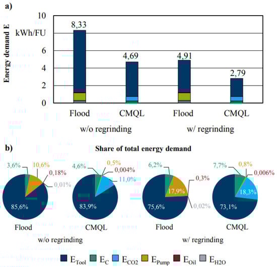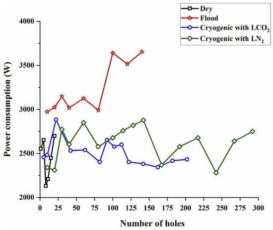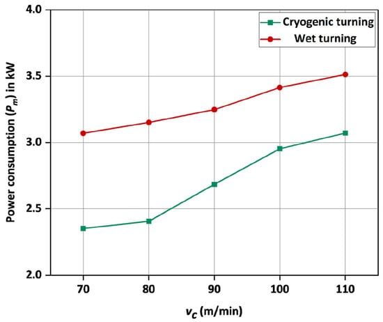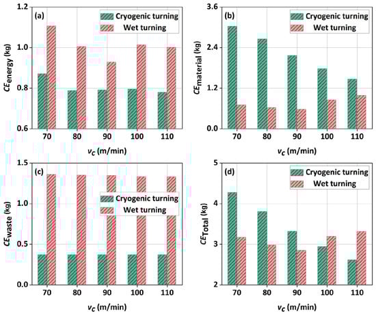 Shah et al. [] found that liquid carbon dioxide (LCO2) outperformed liquid nitrogen (LN2) in machining Inconel 718. Power consumption was reduced by 19% with LNCO2, while the drilling capacity increased by up to 300%. However, according to the life cycle assessment (LCA) results, LN2 is favored due to its lower environmental impact. Following the EN ISO 14044 standard [], the researchers evaluated the energy consumption during milling, taking into account the cutting energy, the pumping energy for flood cooling, and the energy needed for recycling CO2. Gross et al. [] detected that employing the CMQL technique reduced the overall energy consumption by 39% compared to conventional flood cooling. Experiments were carried out across varying material removal rates to evaluate and compare the effectiveness of different cooling scenarios. Agrawal et al. [] investigated various parameters affecting the machining process, including power consumption, tool life, and surface roughness. Additionally, machining costs and carbon emissions were examined to assess the operation from a sustainability standpoint. On the Ti-6Al-4V, an experiment was performed using the cryogenic technique, while wet machining was used as a comparison. Cryogenic machining significantly enhances tool life, more than doubling it at higher cutting speeds. Additionally, surface roughness and power consumption were reduced by 22% and 23.4%, respectively. The use of cryogenic cooling also lowered machining costs by 27% and decreased carbon emissions by up to 22%.