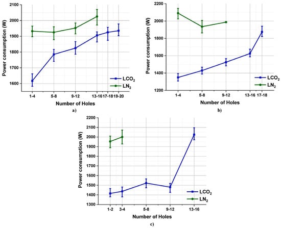 The cutting forces are also one of the essential factors during machining. The cutting forces of two different materials, Inconel 718 and Ti6Al4V, were investigated for different cutting conditions. Researchers examined cutting forces using CO2, MQL + CO2, CMQL, and nozzle modifications at CO2. The researchers examine the radial, tangential, and feed forces at a constant cutting speed of 150 m/min and a feed rate of 0.2 mm/rev. Figure 6a shows the cutting forces for the different cooling conditions with the optimum value found using the CMQL technique, where both the feed and radial forces decreased compared to all other cooling methods. Hybrid cryogenic/MQL helical milling of Inconel 718 reduced cutting forces by 23%, improved hole dimensional accuracy by 28%, and extended tool life by over 35%, compared to conventional methods [].