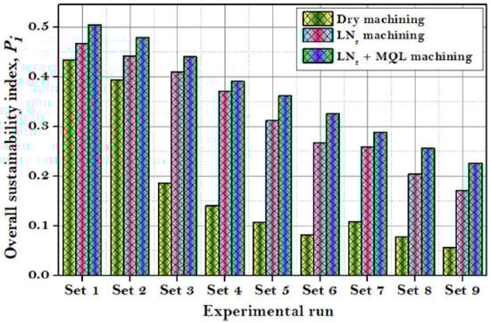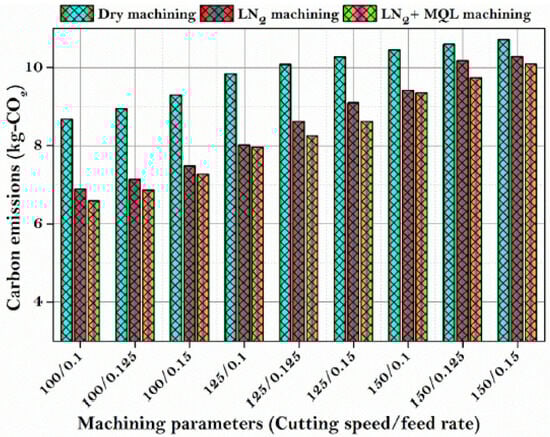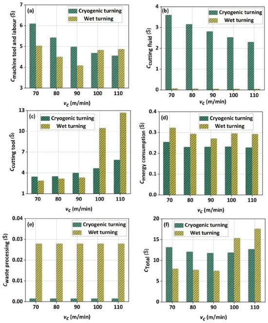 Due to the increase in demand for reducing carbon footprints, Lu et al. [] experimented on metric-based sustainability under cryogenic conditions. To study machining processes under different conditions, the process sustainability index (ProcSI) technique was used. Using high cutting speed, the machining performance was more efficient. When the cutting speed is 500 m/min, the CO2 emissions score is 7.0. Kumar et al. [] studied the sustainability aspect by machining the Ti-6Al-4V using the analytic hierarchy process (AHP) combined with a technique for order preference based on an ideal solution (TOPSIS). A hybrid of MQL and liquid nitrogen, as well as dry experiments, was conducted on it. Using a hybrid system of LN2 combined with MQL resulted in a 16% reduction in energy consumption and a 66% decrease in machining costs. Furthermore, the overall life cycle performance improved by up to 34% compared to dry machining. Rotella et al. [] examined cryogenic cooling from a sustainability perspective and subsequently compared its performance to conventional oil-based and dry machining methods. Coolant consumption is reduced in machining when using near-dry machining, and sustainability indicators showed an improved result. Cutting temperatures, power consumption, and forces decreased due to cryogenic cooling []. A series of experiments was conducted using a combination of cryogenic cooling and minimum quantity lubrication (MQL) at varying pressures. The study evaluated sustainability factors including tool life, chip morphology, cost analysis, and risk assessment. The optimal results were achieved by integrating cryogenic and MQL techniques, resulting in more than a 100% increase in tool life and a 44% reduction in operating costs compared to traditional flooded cooling [].
