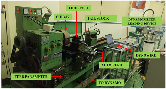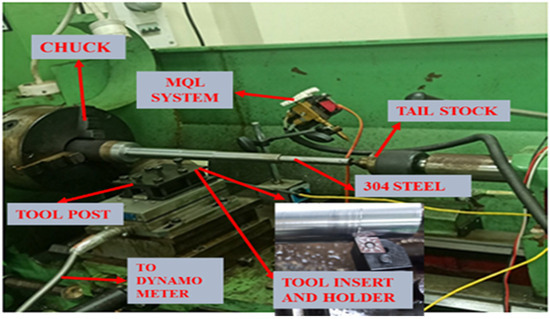 For the flow of cutting fluid, an MQL system which was fixed over the workpiece with its nozzle towards the workpiece and a diameter of 4 mm was used. The distance between the nozzle and the workpiece was kept at 10 cm as shown in Figure 2. The system was fixed at an angle of 15° from the perpendicular axis of the tool. To measure the cutting forces and note it on the computer, software DynoWare (version 2825A) and a piezoelectric dynamometer were used, as shown in the full setup (Figure 3).