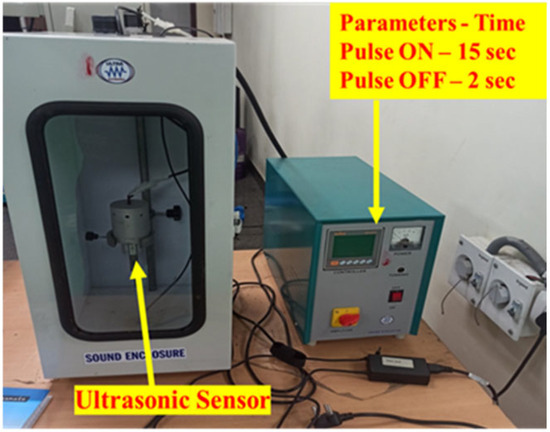 The base cutting fluid will be an emulsion of deionized water and two selective oils, namely, mango seed and pongamia oil. Mango seed oil was purchased from Salvia Cosmeceuticals Pvt Ltd., New Delhi, India, and pongamia oil was purchased from Vyas Pharmaceuticals, Indore, India. To prepare the cutting fluid, deionized water was mixed with different amounts of MSO and pongamia oil (vol%). A total of 1% detergent was added to make it an effective surfactant. To prevent the oil from forming a separate layer on the deionized water, they were kept in an Ultrasonicator, as shown in Figure 4 (model: ULTRA AUTOSONIC manufactured in Pune, India). The cutting fluid was kept in the ultrasonicator for 1 hr at 50 Hz frequency to obtain a homogeneous suspended cutting fluid.