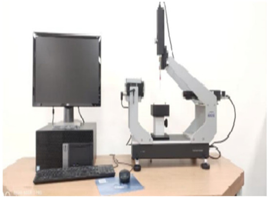A cutting fluid’s wettability characteristic is its capacity to wet the surface of the material it is applied to. The capability of the tool in dissipating heat is indicated by this crucial feature. While measuring the contact angle on the CNMG 120408 WC insert, we can evaluate the wettability property of the fluid. The Kruss Drop Shape Analyzer (DSA) (Figure 5) from Hambarg Germany is readily available and is used to test the wettability of sustainable cutting fluid, which is examined on the tool. There is integrated software installed to measure the contact angle on the cutting tool. The ambient temperature of the software was 27 °C and the drop flow rate for each of the tests was put as 2 µL/s. The measurement of the contact angle was performed on the standard of water droplets, and the contact angle was measured at the tri-junction of the fluid, the solid contact surface, and the air interface. The technique used to make a drop is known as the sessile drop method. The high-resolution camera of the drop shape analyser gave the required measurement after the drop was stable for 10 s as shown in Figure 6. DSA Young’s contact angle equation is given below: