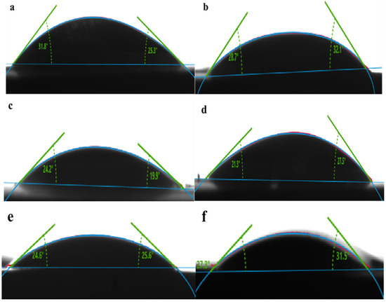 The cutting fluid was prepared in a base fluid of deionized water and 3 samples each of mango seed and pongamia oil in the volumetric ratio of (93:7), (95:5), and (97:3), respectively. The contact angles of each of the samples were evaluated separately as shown in Figure 7.