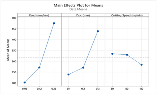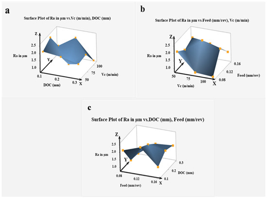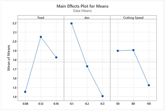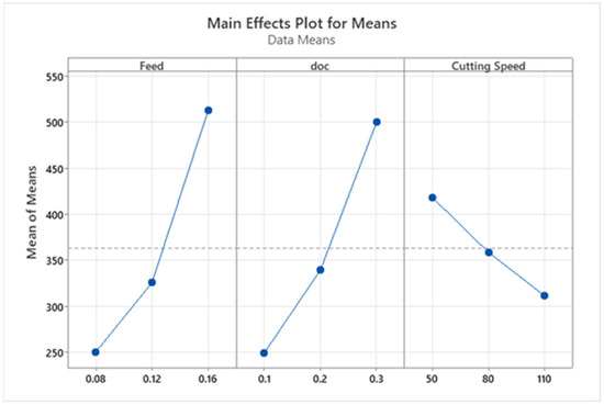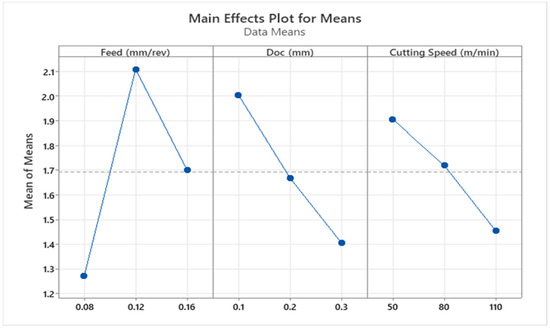 An ANOVA table (Table 8) was developed to investigate how various input parameters affected surface roughness. Of all the input parameters, it was discovered that the feed had the most effect (40.2%) on the reduction in surface roughness [25,26]. It was discovered that the reduction of surface roughness was affected by Vc by 11.76% and the doc by 20.64%. It was concluded that when optimizing the input parameters, feed rate had the greatest contribution