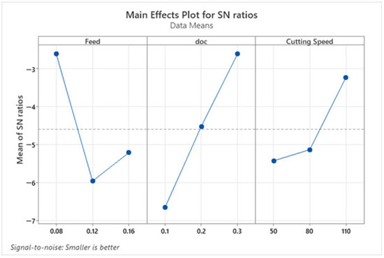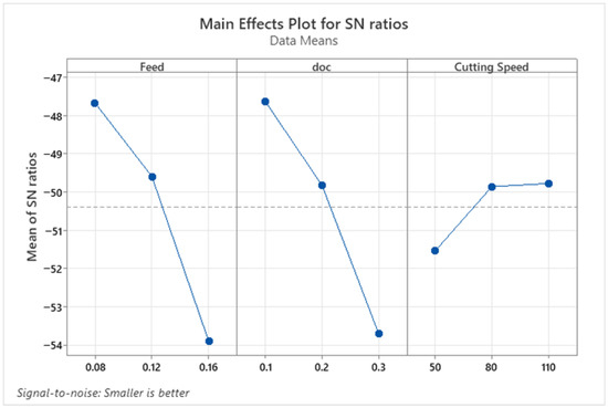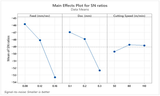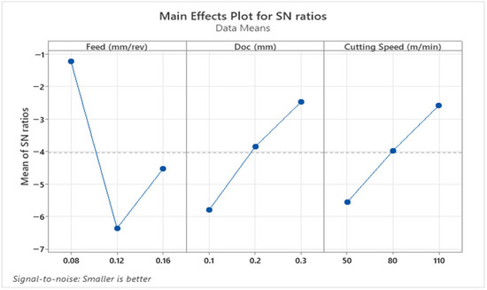 An ANOVA table (Table 15) was developed to investigate how various input parameters affected surface roughness. Out of all the input parameters, it was found that the doc had the biggest influence on the reduction of surface roughness (39.96%). It was discovered that the feed and Vc had an impact on surface roughness improvements by 29.99% and 12.00%, respectively. In a similar study, the reduction in surface roughness by 21% was observed using MQL in the turning of nickel-based superalloy [27]. It was concluded that while optimizing the input parameters, doc had the greatest contribution. The SN ratio table is displayed in Table 16, which can be used to determine the minimum surface roughness requirements [28,29]. By reviewing the SN ratio—smaller is better—the limits for minimum values will be established. The ideal values for feed, depth of cut, and cutting speed were represented in the table as L1, L3, and L3. When the feed is 0.08 mm/rev, the doc is 0.3 mm, and the Vc is 110 m/min, the surface roughness will be at a minimum.
