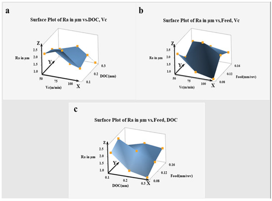 Table 17 reveals the means’ response, which is comparable to the SN ratio in Table 16. It illustrates the significance of the input parameters at the same optimization stage. A set of surface plots was created under turning with pongamia oil-based cutting fluid, and the response of Ra, taking two input parameters at a time, was depicted in Figure 13.