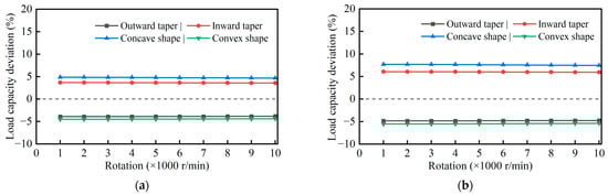 As shown in Figure 13, when the radial straightness error value remains constant, the load capacity deviation of different thrust surfaces stays nearly unchanged as the rotational speed increases. However, as the radial straightness error increases, the deviation in load capacity gradually becomes more pronounced for all thrust surface profiles. Despite this, the order of load capacity from highest to lowest remains the same: concave, inward-sloped, outward-sloped, and convex. When the radial straightness error is 0.63 μm, the load capacity deviations for thrust surfaces constructed using the four different radial characteristic profiles all remain within ±5%.