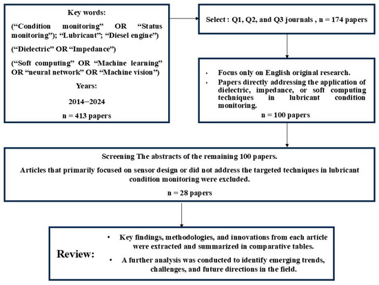 - This process resulted in the final selection of 28 articles that fit precisely within the study framework and offered valuable insights into the application of these technologies in diesel engine lubricant monitoring.
