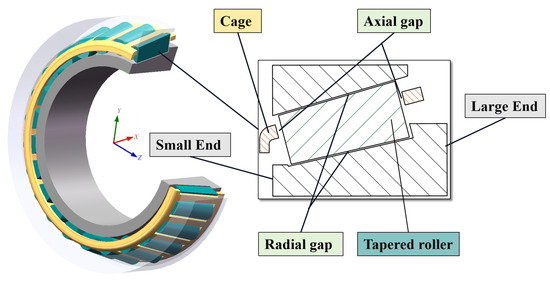 To ensure the accuracy of the numerical simulation of the oil–air two-phase flow field of the bearing under high-speed rotation, it is essential to simplify the model of the tested tapered roller bearing [27]. In practice, the rolling elements, along with the inner and outer rings, are in close contact to ensure the smooth operation of the transmission components. However, this can lead to the fragmentation of the oil and air two-phase flow field during simulations, affecting the smoothness of the numerical flow field simulation. Therefore, to ensure the efficiency of the simulation, as indicated by the reference, the rolling body was scaled down to 95% of the actual size, as shown in Figure 1. The axial gap between the rolling body and the surrounding parts was about 0.15 mm, and the radial gap was about 0.45 mm.