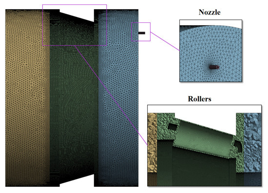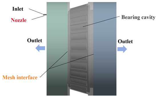 The entire fluid domain mesh was generated using a tetrahedral mesh. To accurately calculate the distribution of lubricants and air in the tapered roller bearing chamber and the oil flow in and out of the bearing, local encryption of the rolling elements, the nozzles, and the mesh interfaces was used, as illustrated in Figure 3.