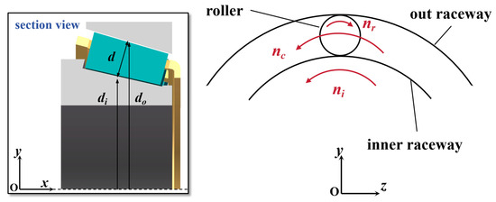 Following investigation and research [29,30], the motion relationship of the rolling elements, cage, inner ring, and outer ring of the tapered roller bearing is demonstrated in Figure 4, and their rotational speed relationship is demonstrated in Equations (7) and (8).