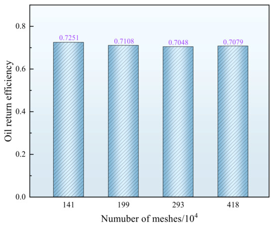To mitigate the effects of the mesh on the numerical simulation results, this study further carried out the operation of local mesh refinement on the structure of the rolling body, mesh interface, nozzle, etc., generating 1.41 × 106, 1.99 × 106, 2.93 × 106, and 4.18 × 106 meshes, respectively, to conduct mesh independence verification. In Fluent, the kinematic parameters for numerical simulation were configured as follows: a bearing speed of 3000 rpm, inlet diameter of 1 mm, inlet velocity of 37.2 m/s, and lubricant RIPP of 555. The oil return efficiency of the lubricant was utilized as the evaluation index, with the results presented in Figure 5. It has been demonstrated that as the number of grids exceeds 1.99 × 106, the oil return efficiency of the numerical simulation exhibits minimal fluctuations and remains relatively stable. To enhance calculation efficiency, the simulation study was conducted using 1.99 × 106 meshes.